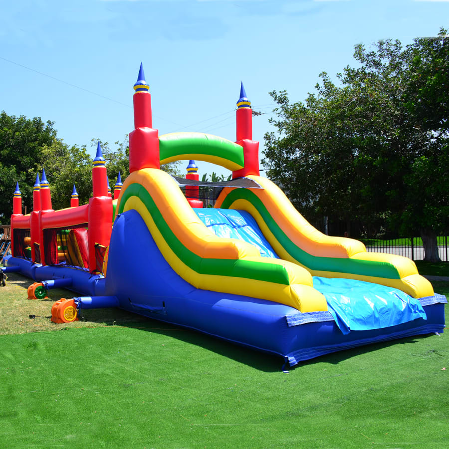The 60 ft Rainbow Titan Obstacle Course ups the difficulty for a long obstacle course! The three-piece open-air design structure enables easy setup. Rainbow archways welcome riders to the obstacle course's starting line, where they must maneuver around a variety of pop-up obstacles.